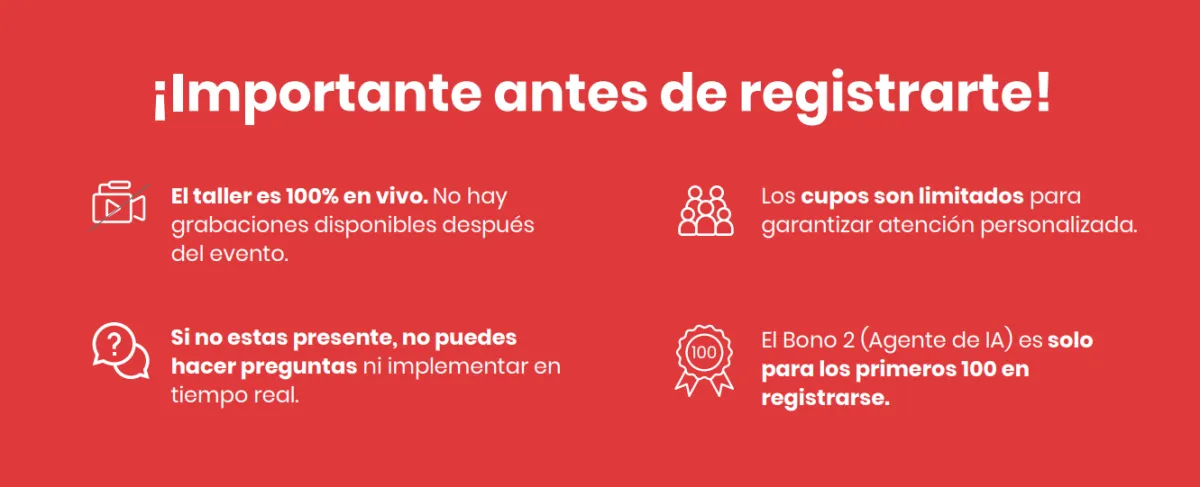 En 3 noches vas a construir tu sistema completo de atracción de prospectos y cierre de ventas usando IA, embudos y WhatsApp — para que los clientes lleguen a ti de forma constante, predecible y automática.
