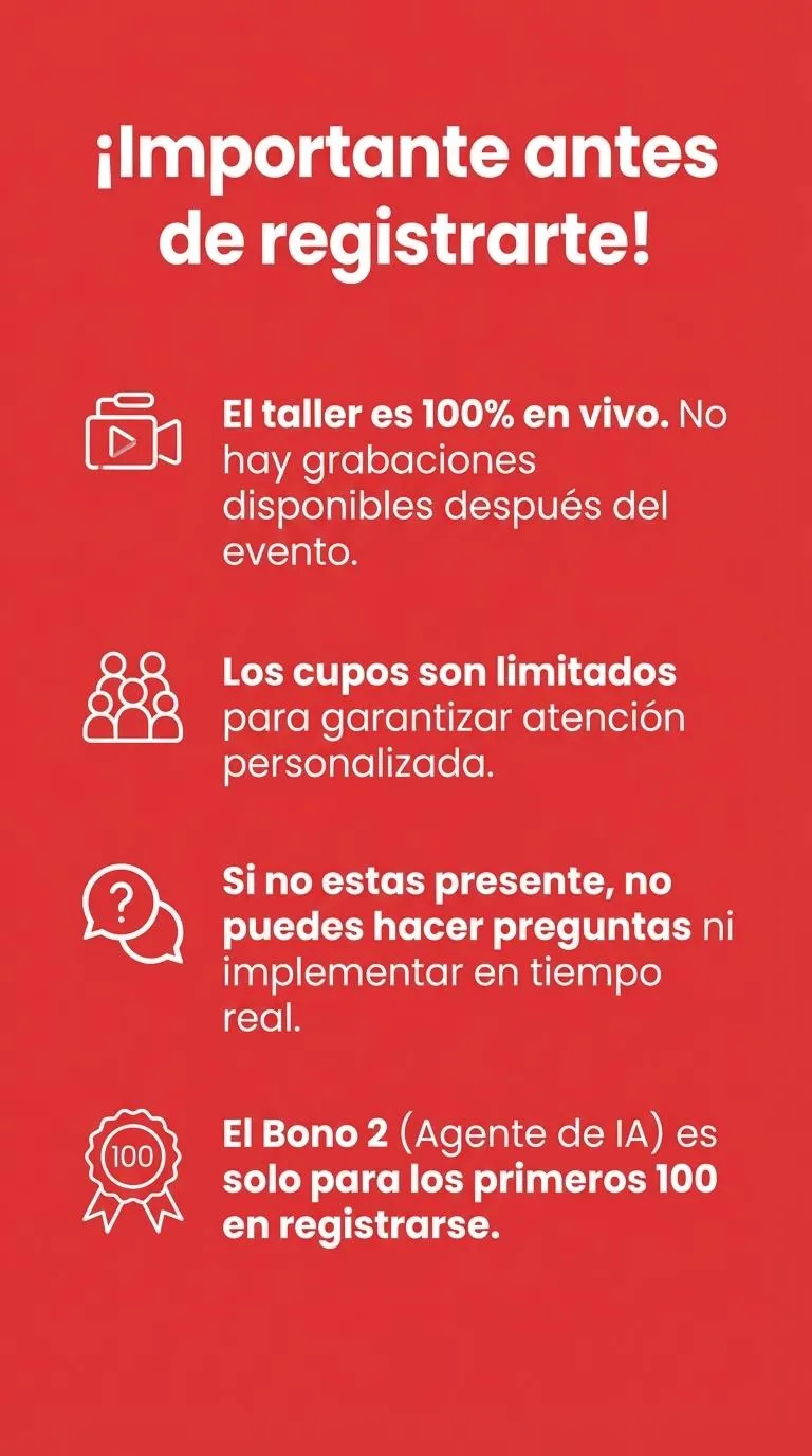 Vas a aprender a usar IA y trafico para atraer prospectos calificados que ya están buscando lo que ofreces. No cualquier persona — las personas correctas, listas para comprar. Sin publicar todos los días. Sin perseguir a nadie. Sin depender de que alguien te recomiende. Al terminar esta noche tendrás tu sistema de atracción configurado y funcionando.